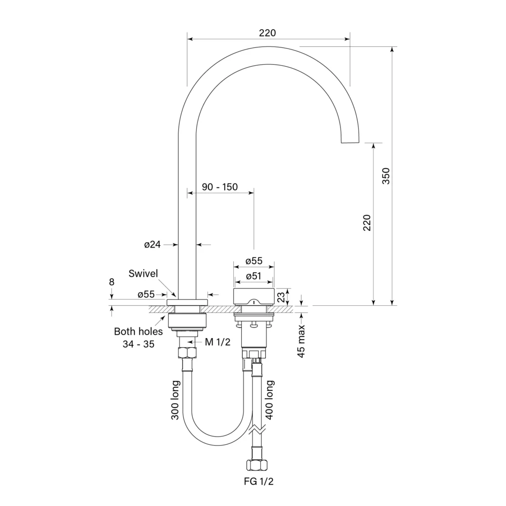 Swivel spout reach 220 mm