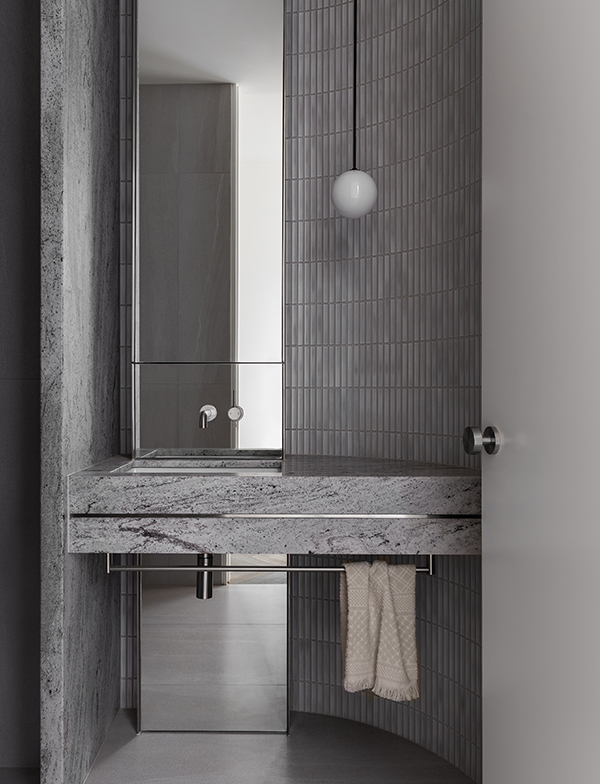 The bathrooms display cool-toned luxury, combining whites and greys with our Brushed New Nickel tapware for a calming effect. The tall ceilings engender feelings of spaciousness, despite the compressed nature of the home. Curved walls make for fluid transitions, and along with bold stone and grey finger tiles, create a gorgeous silvery-toned retreat.