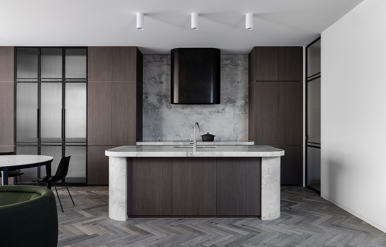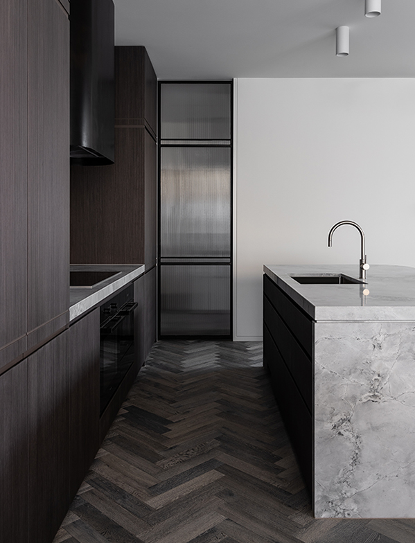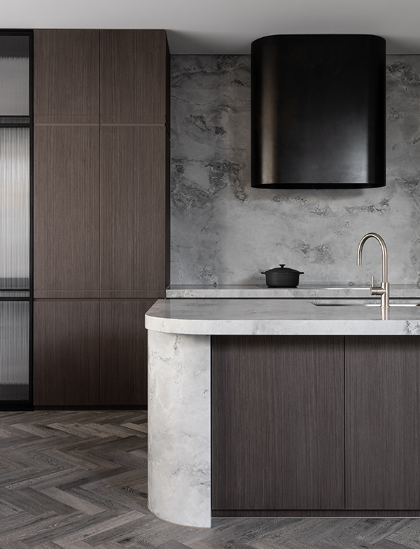 The kitchen makes a statement with dark shades, yet the overall aesthetic remains soft with tonal curved stone and the homely texture of wood. Seamless integration of all aspects in this space make for a sophisticated and clean look, accentuated by the subtle Brushed New Nickel finish on our sink mixer which artfully ties the look together.