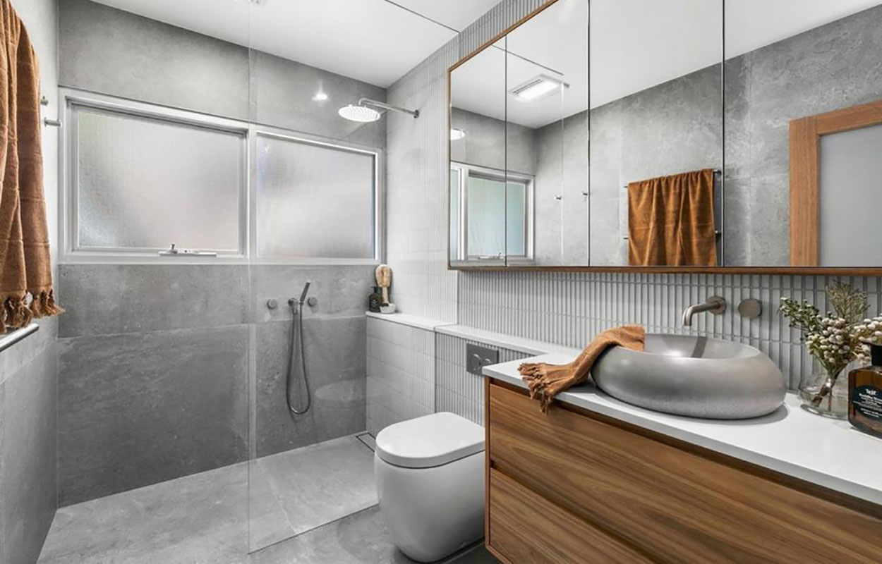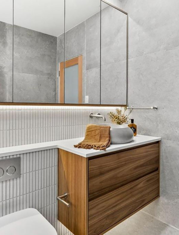 Cool grey tones as a result of the tiles, basin and Brushed New Nickel tapware are contrasted with the deep warm of the wood vanity and the vivid terracotta towels in this bathroom. With strip lighting and finger tiles, this space is modern and uniquely eye-catching.