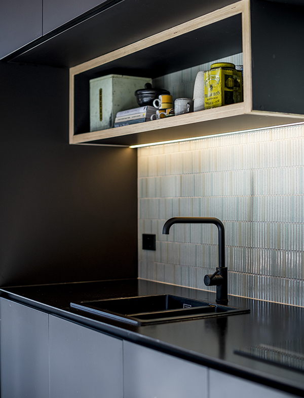 The soft squares of our Pegasi sink mixer only enhance the refined ambience of the open-planned kitchen; the smooth black contrasted by stunning splash back finger tiles, and complimented by the textured concrete kitchen island. Handleless kitchen cabinetry make for easy cleaning, and reinforce the purpose of simplicity for this home.