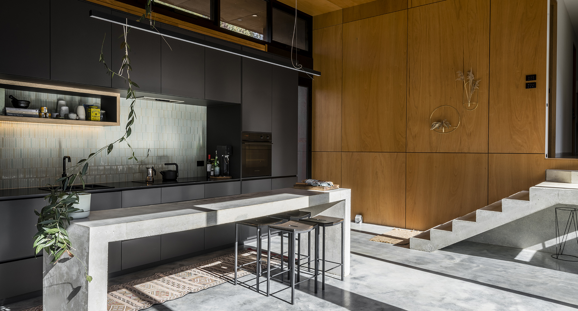 The combination of moody blacks, character-brimming concretes and warm organic woods create a modern yet cozy aesthetic throughout the home, whilst still maintaining an elegant quality.