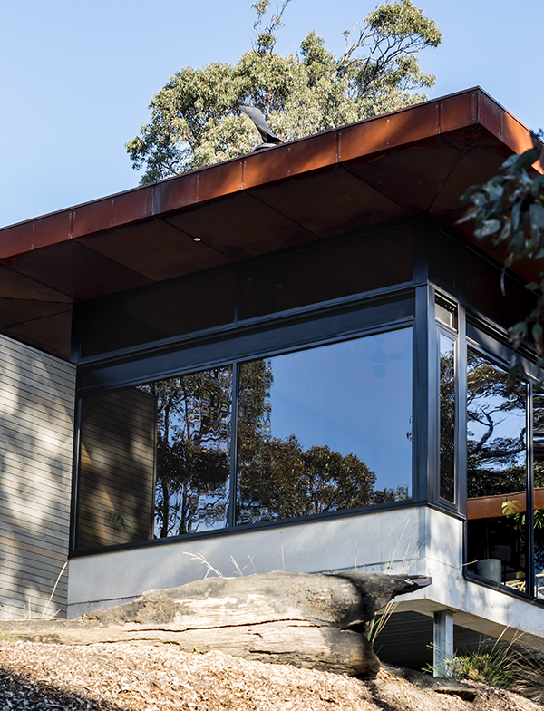 The striking coastal Bimbadeen house located amongst the trees in Fairhaven.