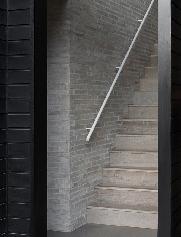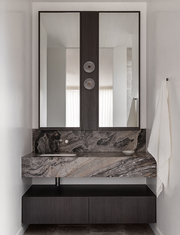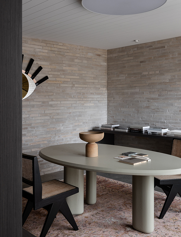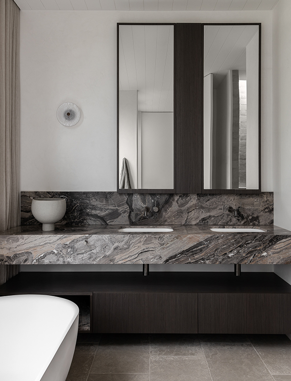 The interior features a neutral palette and cool tones for a sophisticated and masculine look. Natural and sustainable materials such as handmade bricks, timber joinery, and marmorino render depict the home’s authenticity and reference the strong link to the landscape.