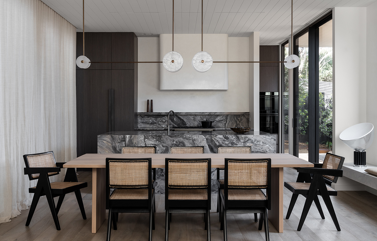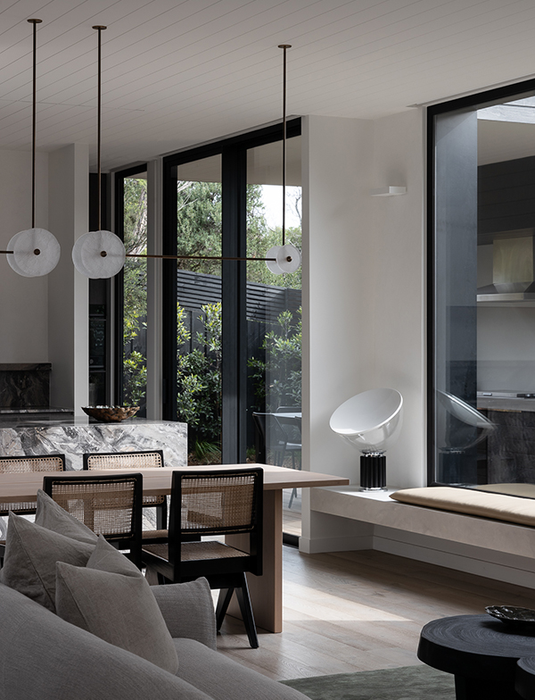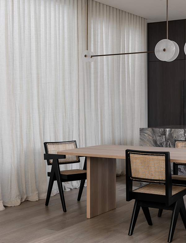 Warming up the space is a custom dining table, a simplistic piece which gives the illusion of two slightly seperated slabs of timber. Rattan chairs and linen curtains work to soften the area for a homely feel.