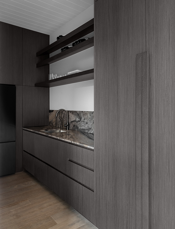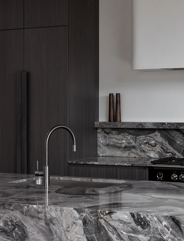 Dark cabinetry and deeply variegated stone in the kitchen and butler’s pantry extend upon the moody feel, while the use of our Pegasi sink mixer aligns with the the home’s focus on beautiful and quality pieces. The Brushed Graphite finish is a deep metallic grey which extracts the rich tones in the stone.