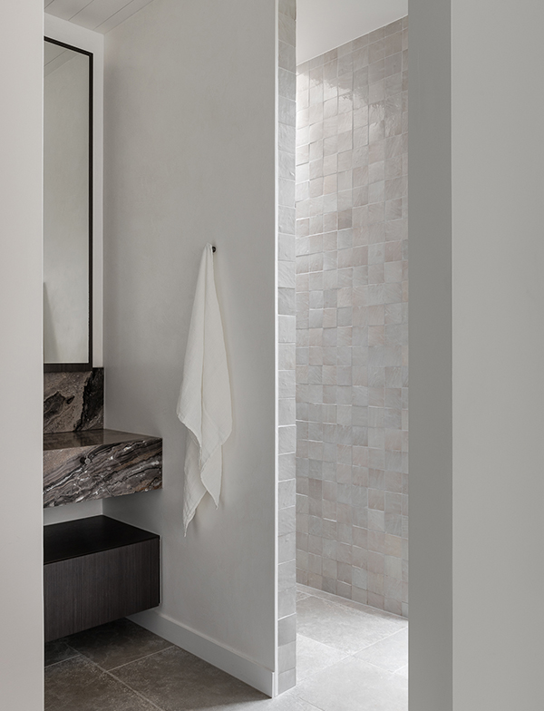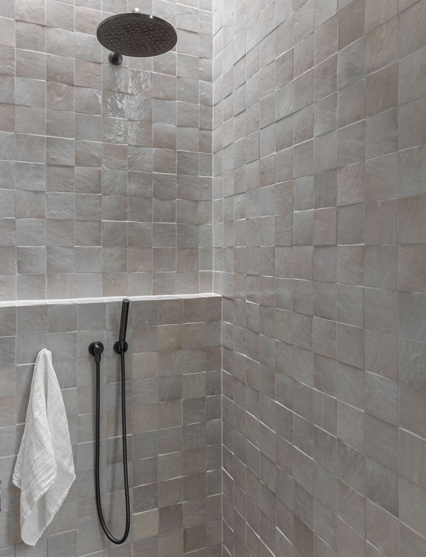 The bathroom features a separate shower room adorned with zellige tiles and fitted with Pegasi shower pieces. The main space includes the same stone and tapware finish as the kitchen, a combination that heroes both designs and materials.