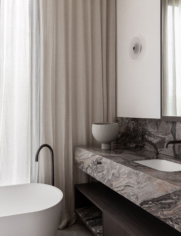 Beige linen curtains, protruded mirrors, and Brushed Graphite tapware create the multi-layered look in the main bathroom. The design displays warmth and softness, yet the bold character is never dismissed with its clean lines and streamlined appearance.