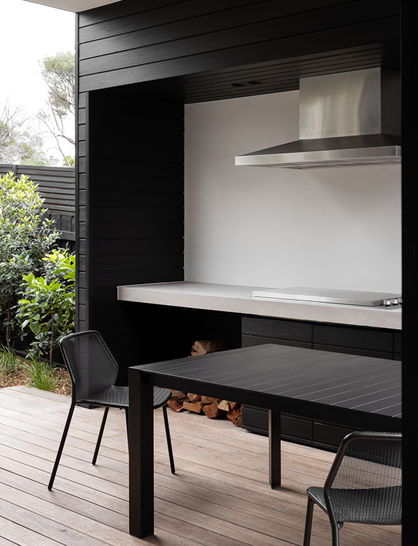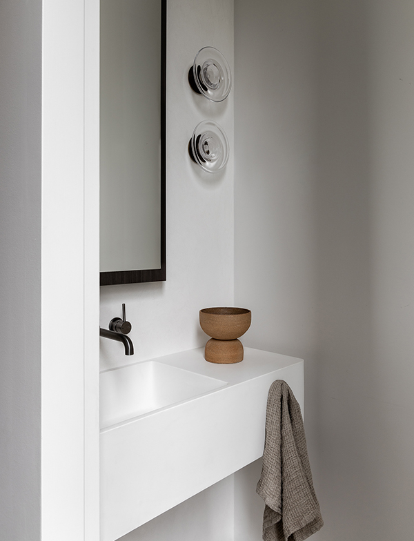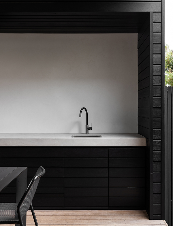 With the majority of the home featuring multiple tones of beiges and greys, the powder room and alfresco keep to a simpler monochromatic look. Solid blocks of black and white make the statement, with the tapware becoming a focal point due to its unique hue.