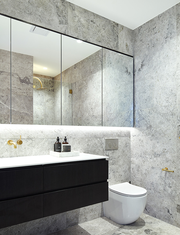 The main bathroom utilises Raw Brushed Brass tapware to create striking contrast against the Tundra Blue Marble. The black custom vanity completes the look, making a statement against the neutrals of the rest of the space.