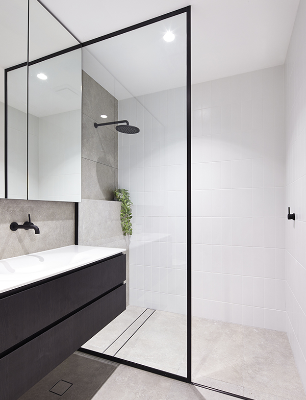 The same custom vanities and mirrors are used throughout the home to keep the look consistent and create a sense of flow throughout. The statement black shower frame in this bathroom was matched in, the small details adding up to make the space look polished and give it a luxury feel.