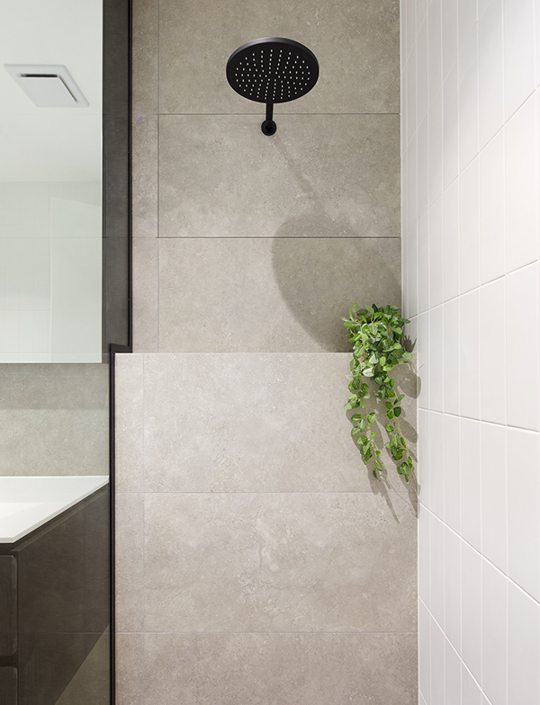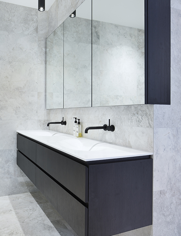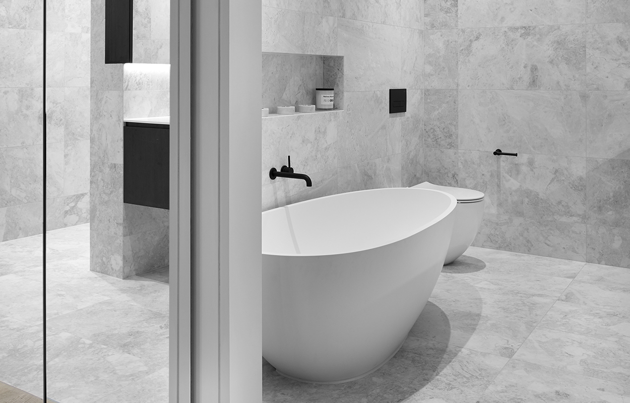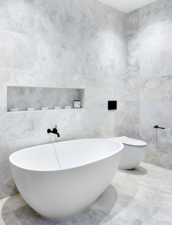 Floor to ceiling Elba marble tiles speak luxury and charm in the master bathroom. Matte Black Pegasi tapware and accessories make for a dignified partner in this space, complementing other black details that make up the monochromatic look.