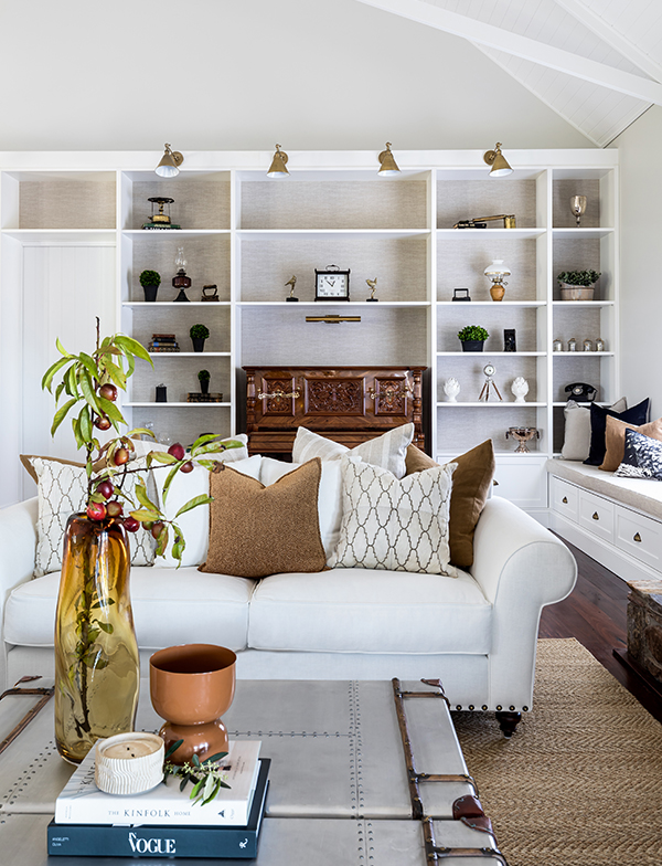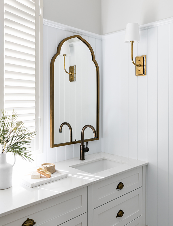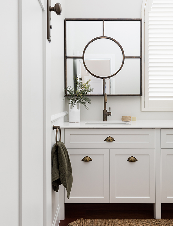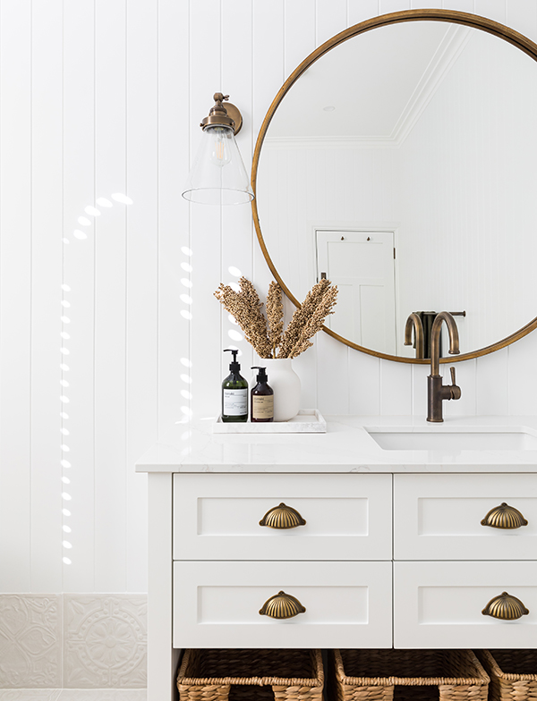 The main bathroom has a more minimalist design than the living areas, though carrying through the same dreamy feel, created in this space by the lining boards and texturally detailed tiles. Bright whites accented by aged brass fittings feature in this sundrenched space, working together with natural aspects such as the timber stool and native plants.