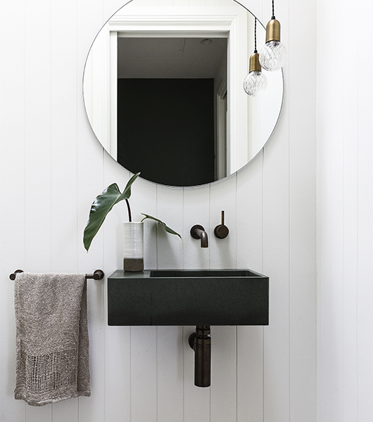 Loving this vibrant powder room in the Freshwater Headland project features a Slab Shapers basin in a deep eucalypt hue which is perfectly complemented by the Antique Brass Medium tapware and accessories.