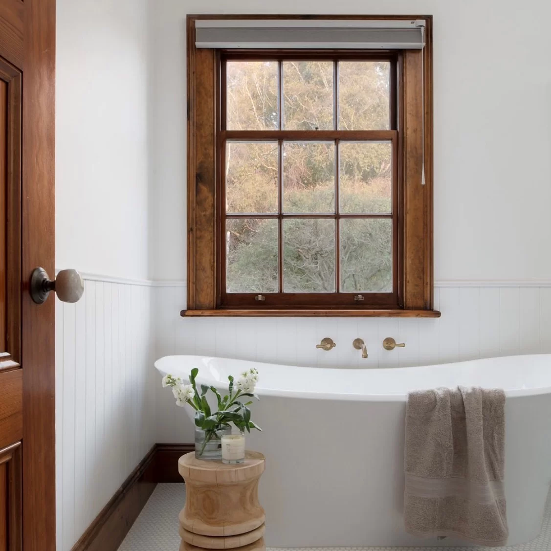 Retaining the original timber windows and doors in the bathrooms gives them authenticity and character, while the new layout gives improved functionality. The stunning dark forest green vanity and Carrara Marble tops add a level of sophistication to the design, which look perfect against the Easycraft VJ wall panelling and white penny rounds.