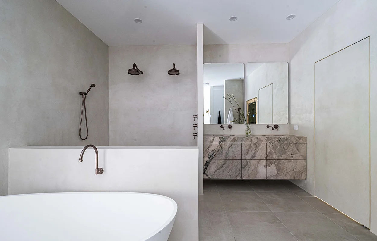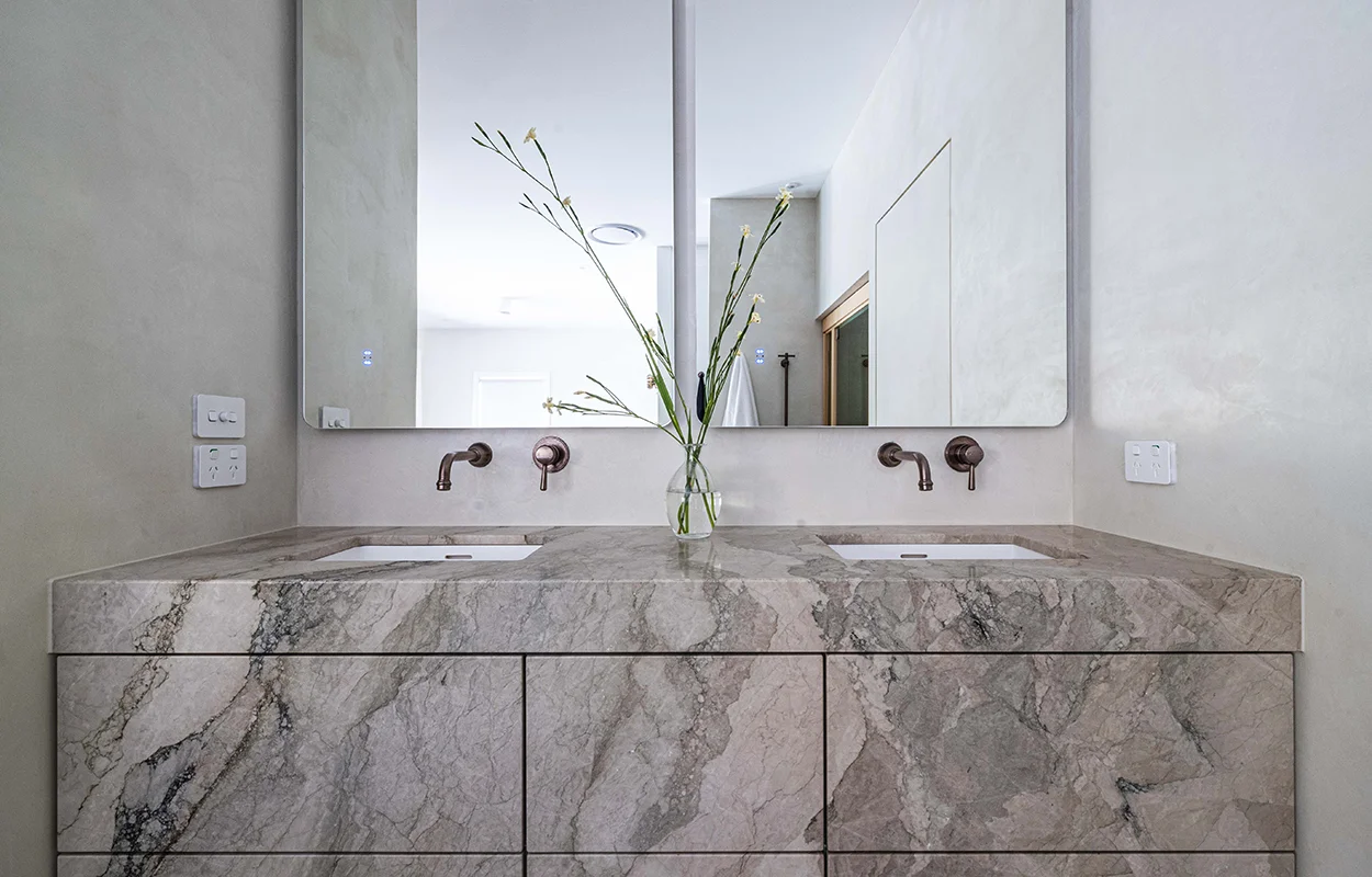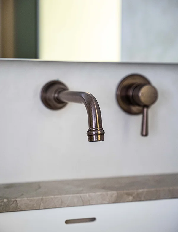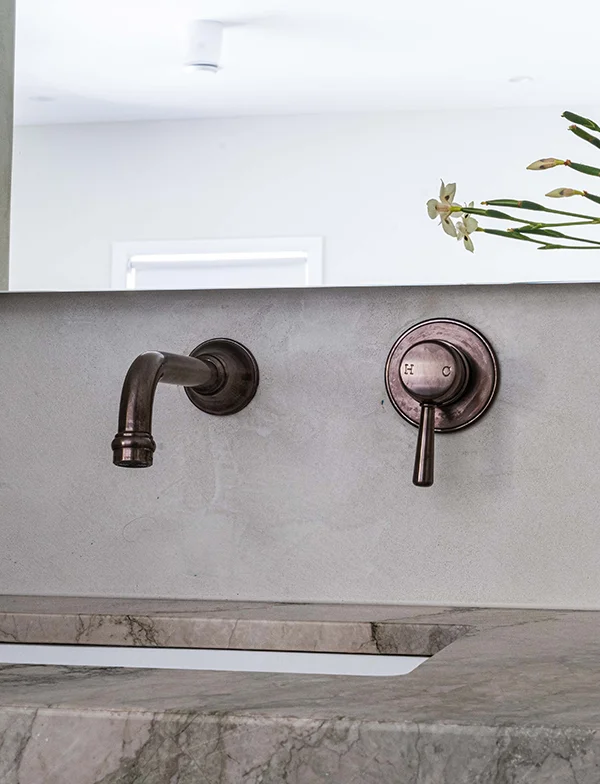 Statement marble was chosen for the vanity, a timeless material synonymous with luxury. The stone complements the Armada Bronze finish beautifully, which is set against a textured wall for contrast.