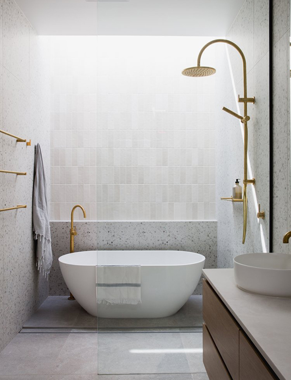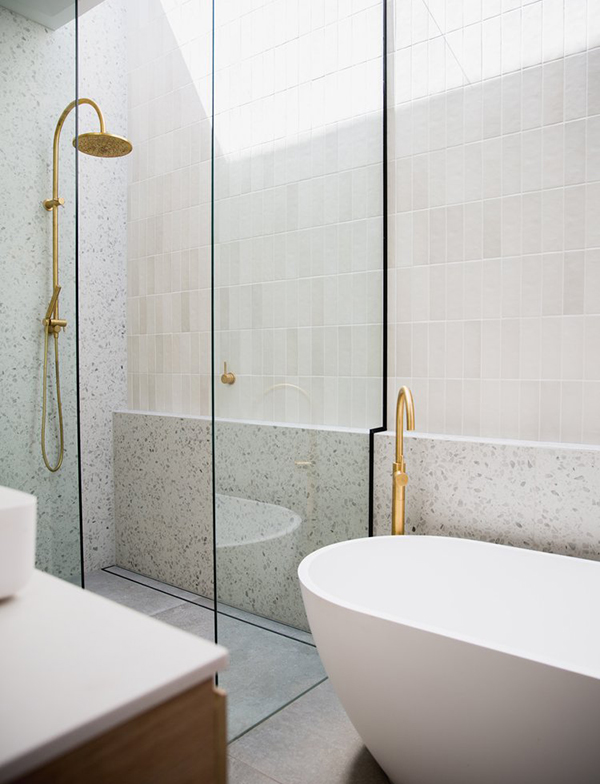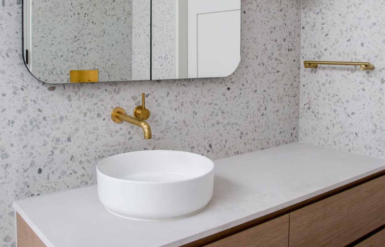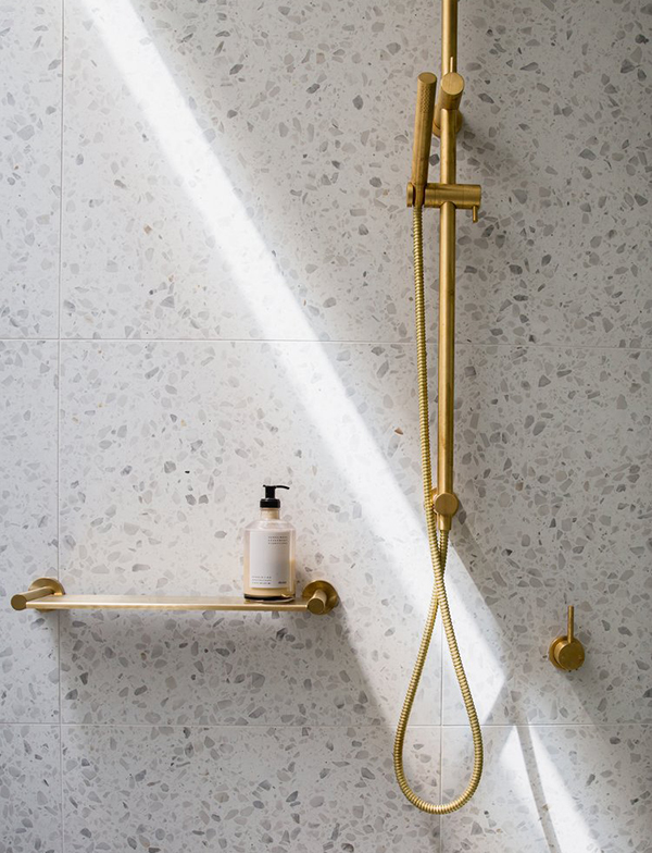 Raw Brushed Brass fittings make a statement against a muted greyscale terrazzo in the teen’s bathroom. The timber vanity works to warm up the space, along with the windows allowing natural light to cascade down the back wall adorned with soft-toned Moroccan style tiles.