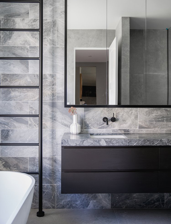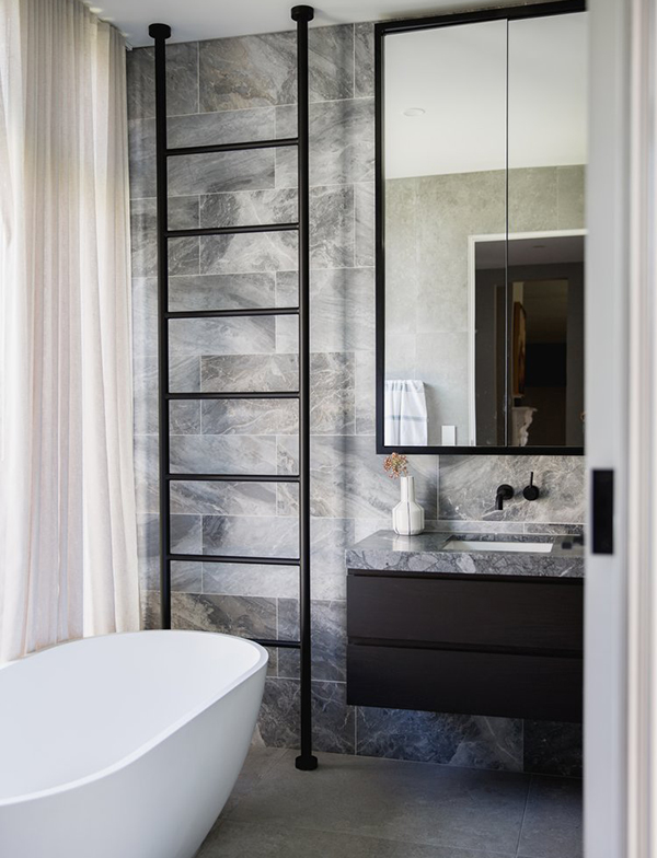 The master ensuite has a more rigid masculine aesthetic with richly detailed natural stone, dark wood joinery and Switzrok Matte Black tapware. Linen curtains bring in warmth and softness, once again providing a luxurious yet homely space.