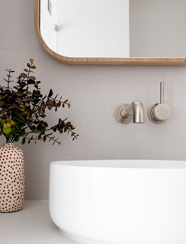 Classic Brushed New Nickel tapware looks incredible in this simplistic yet sophisticated bathroom. The terrazzo look tiles add interest, complementing the clean lines of the rest of the space. With the use of subtle warm tones and soft curves, the bathroom is transformed into a tranquil retreat.