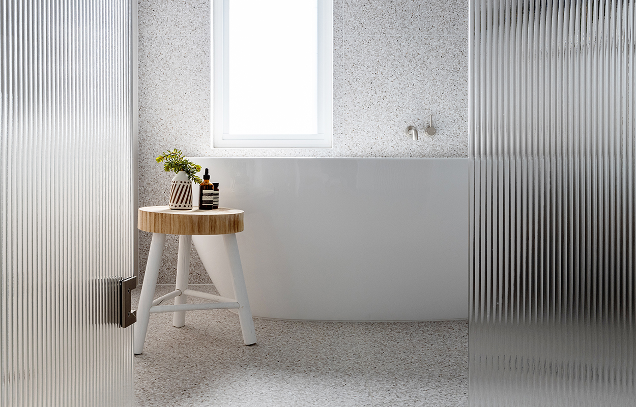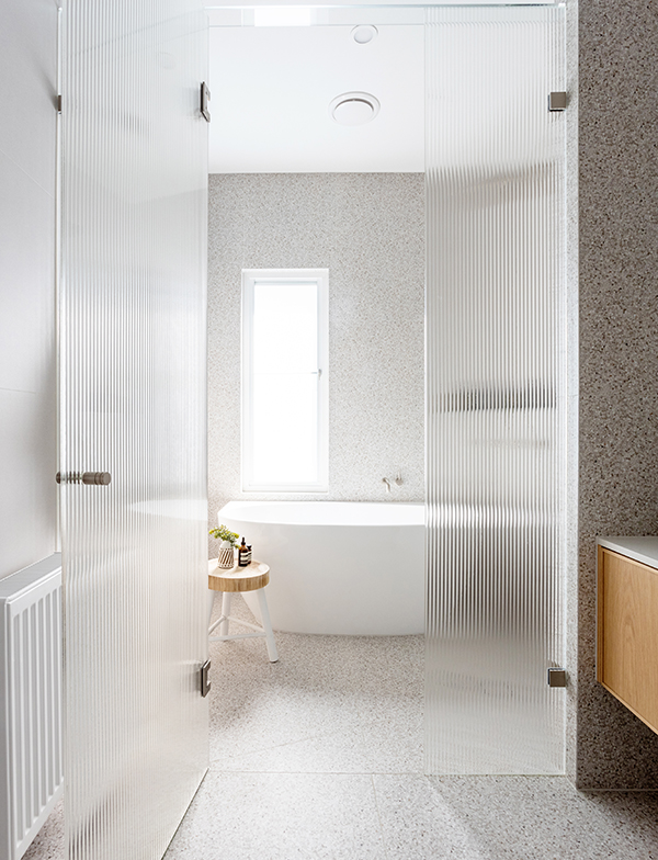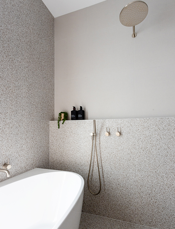 The bathing niche features a wall shelf, tall fluted glass and muted speckled tiles, as well as more of our brushed nickel finish chosen for the showers and mixers. Despite the separation of the bathing area from the rest of the bathroom, the space feels open and airy due to the ample light and the consistent use of tonal elements throughout.