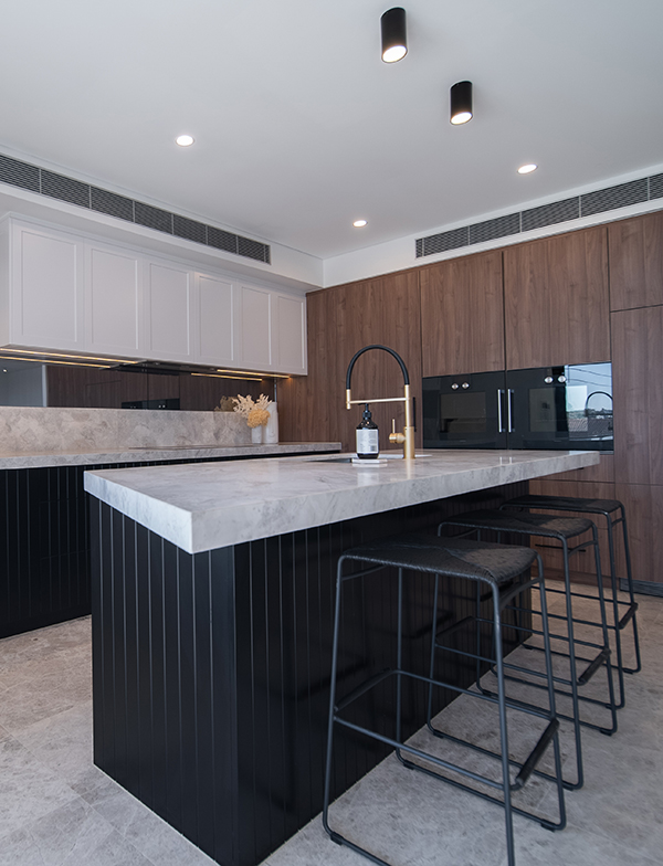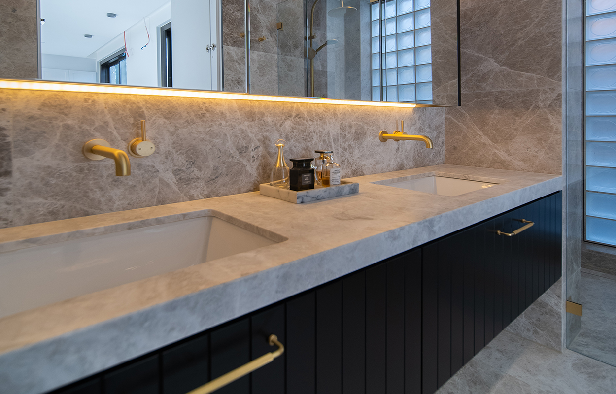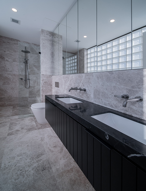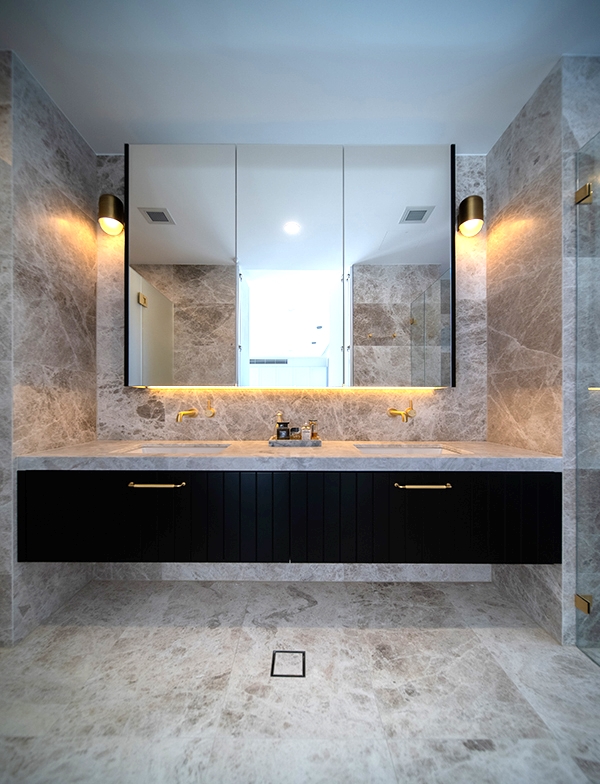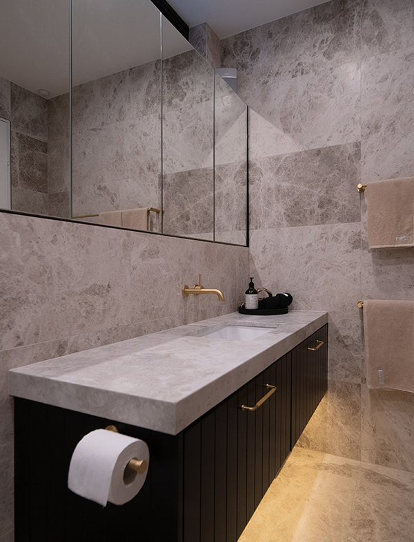 The master bathroom looks just magnificent covered floor to ceiling with the Tundra Marble from Amalfi Tiles. With such incredible variation, it collaborates beautifully with the black cabinetry and our timeless tapware for an astonishingly luxurious and extravagant look. Lighting plays such an important part in this space; the wall sconces and under-cabinet lighting add depth and warmth, perfectly complementing the materials used.