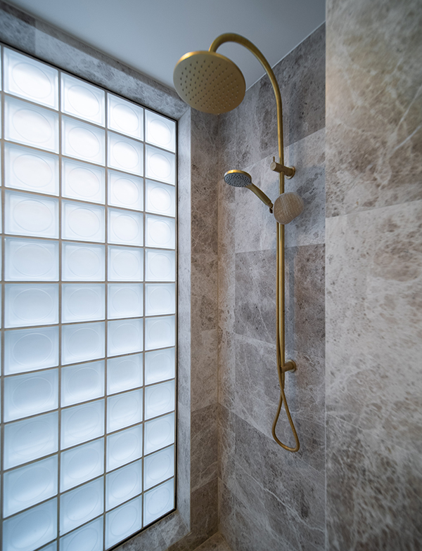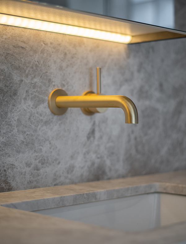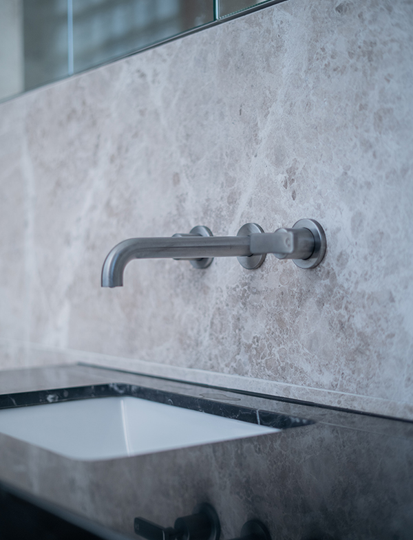 This master bathroom exudes cool tones as a result of using our Brushed Graphite tapware. This stunning deep grey has a metallic lustre and accentuates the darker shades in the stone. Also featured are our Chisel D lever handles, a classic addition to the space. Their clean lines and contemporary feel collaborate perfectly with the simplicity of our Pegasi wall spout.