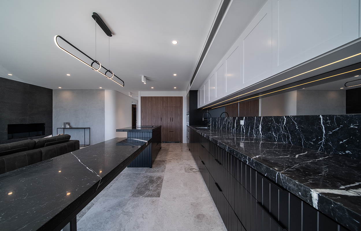 Such an incredible blend of blacks, whites, variated stones and natural woods in the kitchen and living area of the first apartment. Its open-planned structure complete with large windows establishes a spacious and airy feel. Each of the materials used is beautifully complemented by the Brushed Liberty Gold finish on our sink mixer, which brings out the warm tones in each.