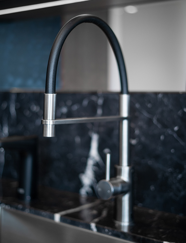 The kitchen of the second apartment features Nero Marquina marble by Overlook Tiles, which demands attention with its deep hue and bold veins. Combined with black cabinetry, the space is daring and exquisitely striking. Our Brushed New Nickel pull down mixer and great use of lighting completes the look, bringing it to a spectacular finish.