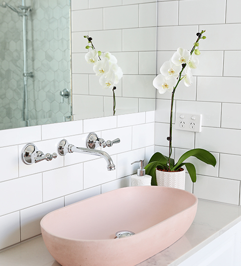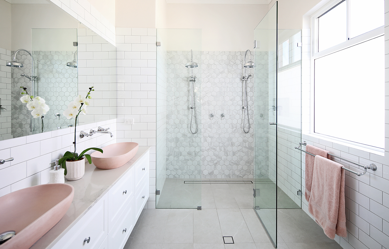 The custom double vanity features blush concrete basins by Concrete Nation, which add a beautiful feminine touch to the ensuite, and look perfect with the mix of subway and marble tiles. The generous double shower is complete with Cascade Dual Showers, which provide the luxury of both hand held showers and overhead rain showers.