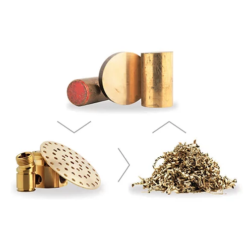We treat this metal as precious. Every shaving that falls from our lathes and every off-cut gets collected and recycled. Many of our parts are made from brass bar, tube or plate. This material gets turned, milled and bent and many processes involve machining to shape the brass into a component. Machining involves sharp cutters that shave off small pieces of brass swarf. This gets collected from each machine then melted down to create new bars.
